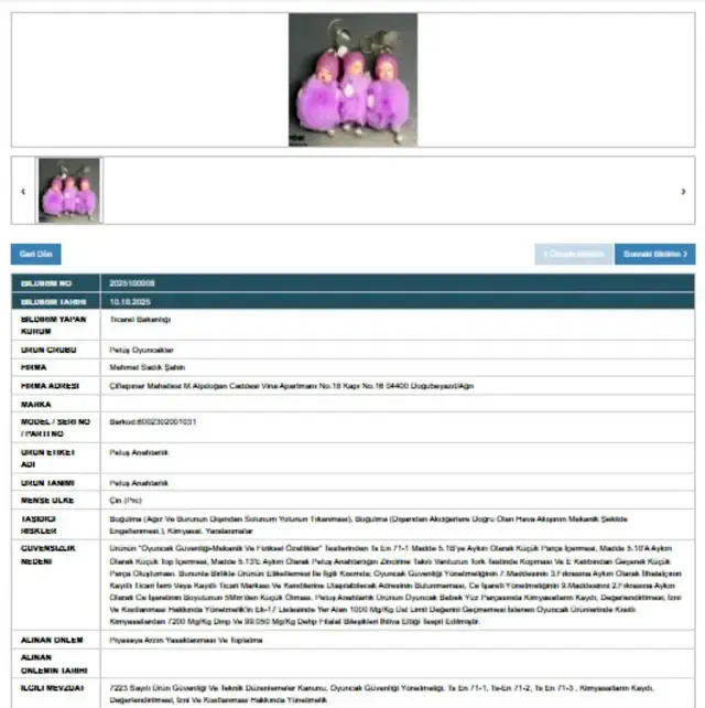 Yapılan incelemelerde Çin menşeli peluş anahtarlığın yönetmeliğe aykırı olduğu ve içeriğinde sağlık açısından risk oluşturan kimyasal maddeler bulunduğu belirlendi. Bakanlık, üründe boğulma ve kimyasal risk tespit edilmesi nedeniyle toplatma kararı aldı.