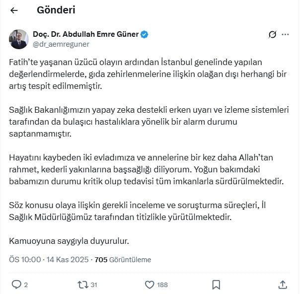– Fatih’te yaşanan üzücü olayın ardından İstanbul genelinde yapılan değerlendirmelerde, gıda zehirlenmelerine ilişkin olağan dışı herhangi bir artış tespit edilmemiştir. Sağlık Bakanlığımızın yapay zeka destekli erken uyarı ve izleme sistemleri tarafından da bulaşıcı hastalıklara yönelik bir alarm durumu saptanmamıştır. Hayatını kaybeden iki evladımıza ve annelerine bir kez daha Allah’tan rahmet, kederli yakınlarına başsağlığı diliyorum. Yoğun bakımdaki babamızın durumu kritik olup tedavisi tüm imkanlarla sürdürülmektedir. Söz konusu olaya ilişkin gerekli inceleme ve soruşturma süreçleri, İl Sağlık Müdürlüğümüz tarafından titizlikle yürütülmektedir. Kamuoyuna saygıyla duyurulur.