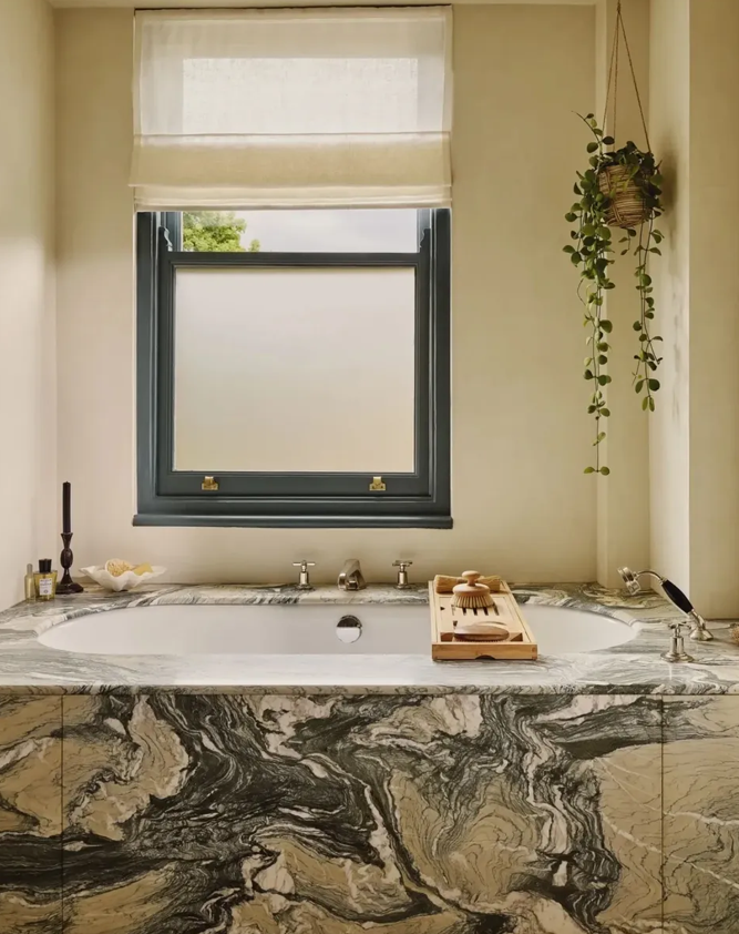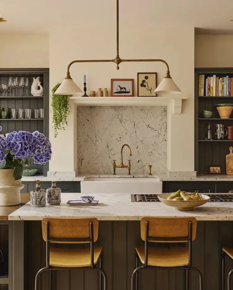 Antrede ise petrol mavisi duvarlar, rustik pirinç detaylar, mermer tezgahlar ve desenli fayanslar dingin bir köşe sunuyor.