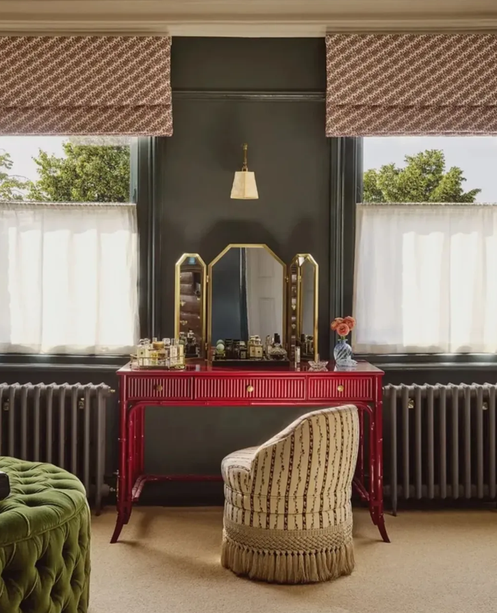 Yatak odasında yer alan kırmızı dresuar ve üzerindeki kanatlı ayna görenleri hayran bırakıyor.