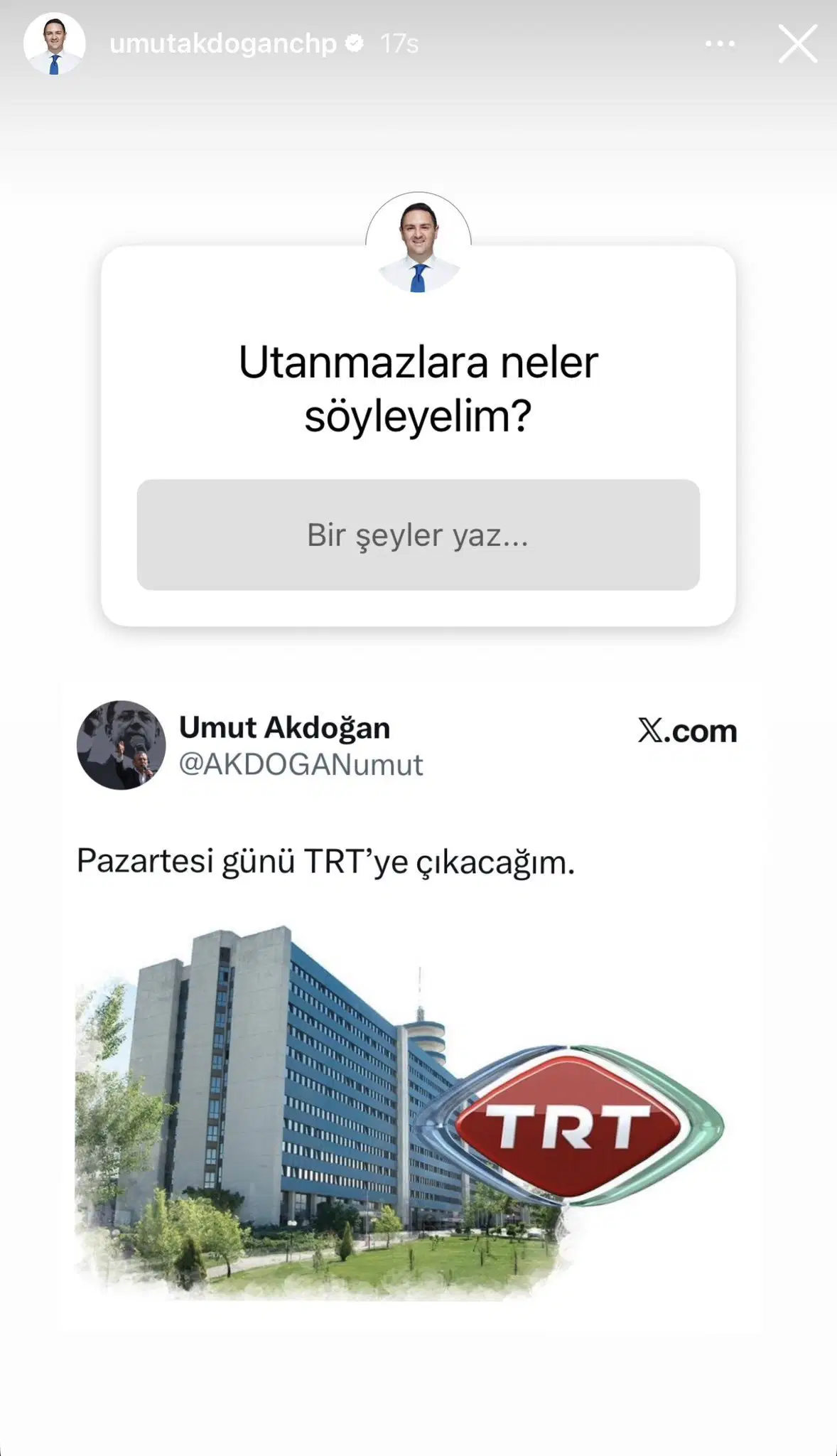 CHP Ankara Milletvekili Umut Akdoğan, X hesabından dikkat çeken bir paylaşım yaptı. Akdoğan, 14 Kasım günü yaptığı açıklamasında, “Pazartesi günü TRT’ye çıkacağım” ifadelerini kullandı.